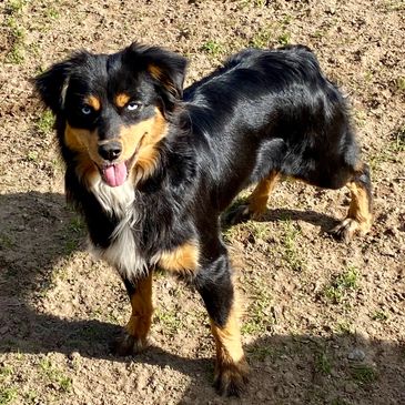 She is a couch potato in simple terms. She can cuddle with you all day and be content. Of course she enjoys the outdoors and fun activities, but she is more laid back than the others. She loves walks and socks for some reason, but over all a well rounded dog. She is a great example of a Mini American Shepherd/ Mini Australian Shepherd. She stays here in Gilroy most of the time with me. She does go to my parent's ranch when we go and has spent time there as well.