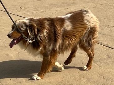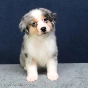 "Rojo" is a nice built puppy who came from Judy at Coyote Creek Mini American Shepherds all the way in Kansas! I was in desperate search for my new Stud since my beloved BLUE was not fertile at his semen evaluation.I was heartbroken but not defeated. After searching for almost 2 years I found my match! He is a Red Merle with ghost eyes. His temperament is perfect and is a low energy boy. Looking nice and stocky which is what I want to add to my lines. He might grow a little large for conformation but we may try something else for him.